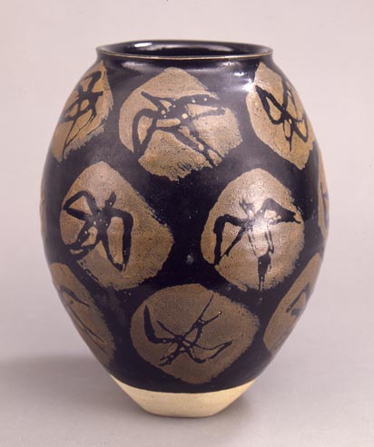 石黒宗麿:黒釉褐斑鳥文壺 (1958)