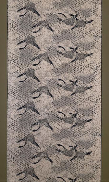 小宮康正:長板中形着尺 破れ紗綾形地に雁 (1989)