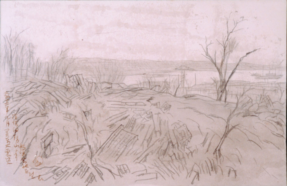 池田遙邨:大正12年9月関東大震災 横浜伊勢山より船渠会社を望む (1923)