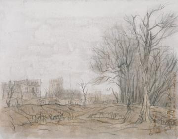池田遙邨:大正12年9月関東大震災 東京向島徳川邸内にて札幌麦酒を望む (1923)