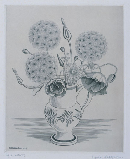 長谷川潔:花瓶に挿したコクリコと種草 (1937)