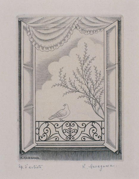 長谷川潔:開かれた窓と小鳩(1952年賀状用) (1951)