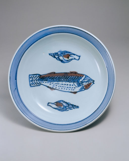 富本憲吉:染付銅彩魚と貝大鉢 (1935)