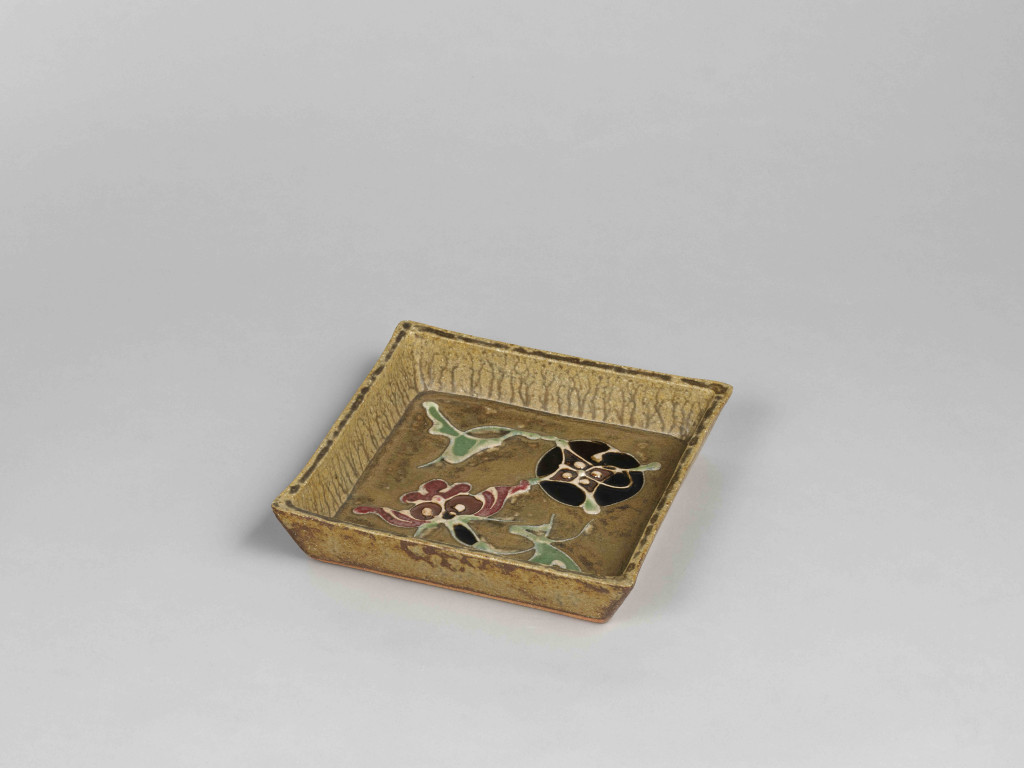 河井寬次郎:黄釉筒描花文四方鉢 (1953)