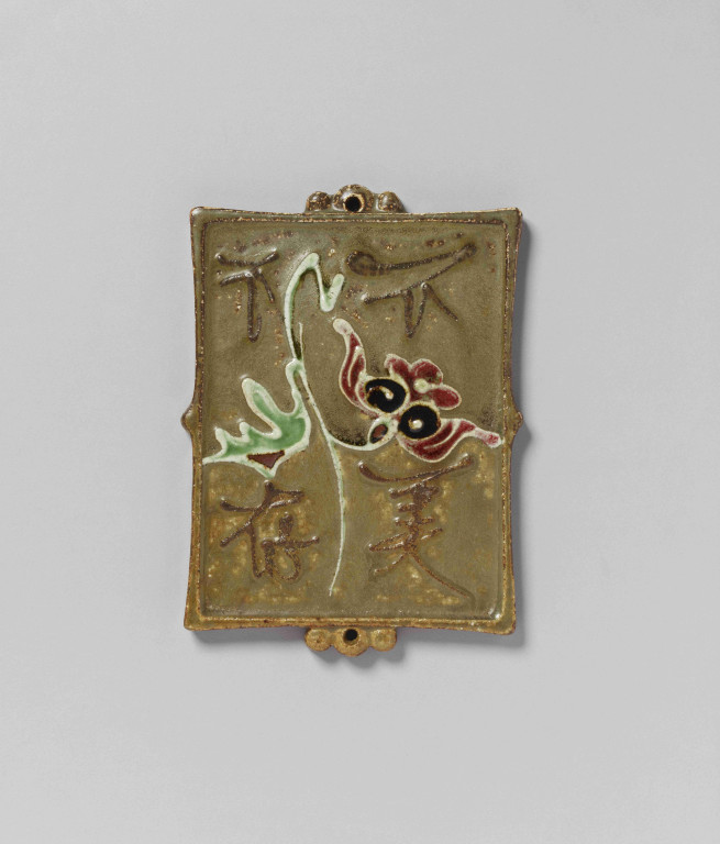 河井寬次郎:黄釉筒描花文陶板「不美不存」 (1955)