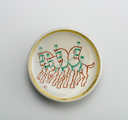 河合卯之助 / 絵付: 川西 英:曲馬赤絵皿 (date unknown)
