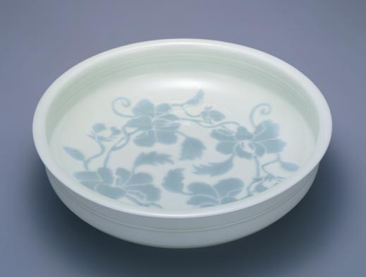 井上萬二:黄緑釉牡丹彫文鉢 (1989)