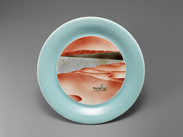 三浦小平二:青磁茜豆彩大皿 火焔山 (1982)