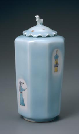 三浦小平二:青磁豆彩蓋物 トルコ文 (1986)