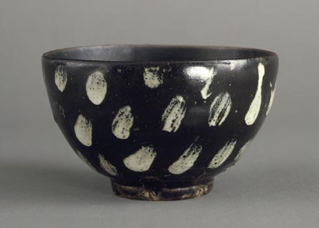 石黒宗麿:黒釉白斑文茶碗 春雪 (c.1950-52)
