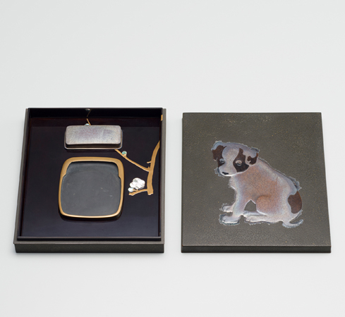 迎田秋悦 / 図案: 鹿子木孟郎:仔犬蒔絵硯箱 (1909)