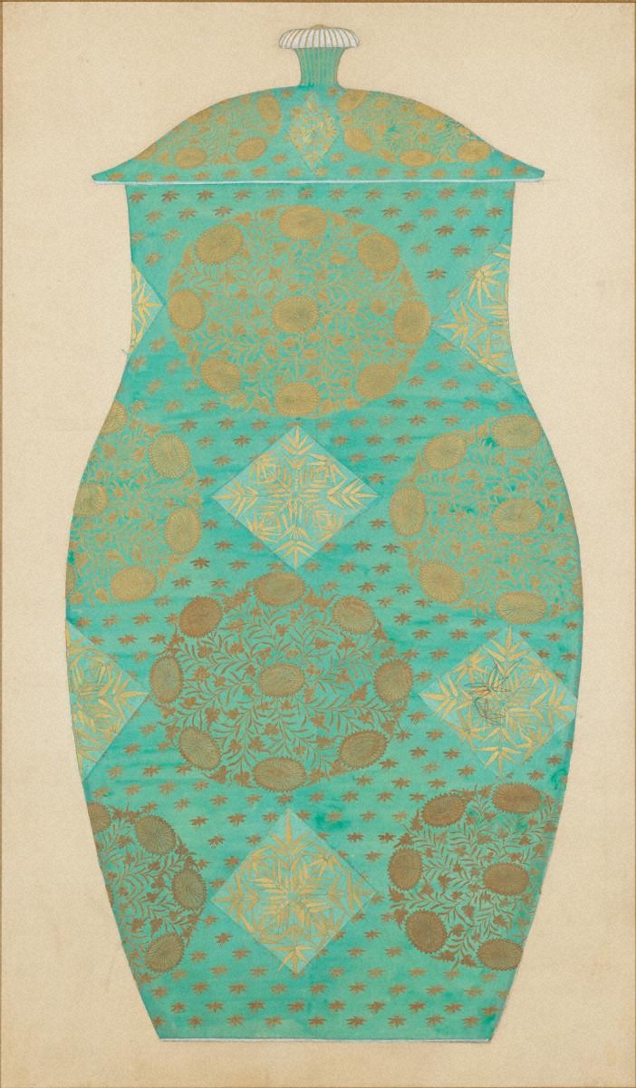 加藤土師萌:下図「萌黄金襴手蓋付飾壺」 (1968)