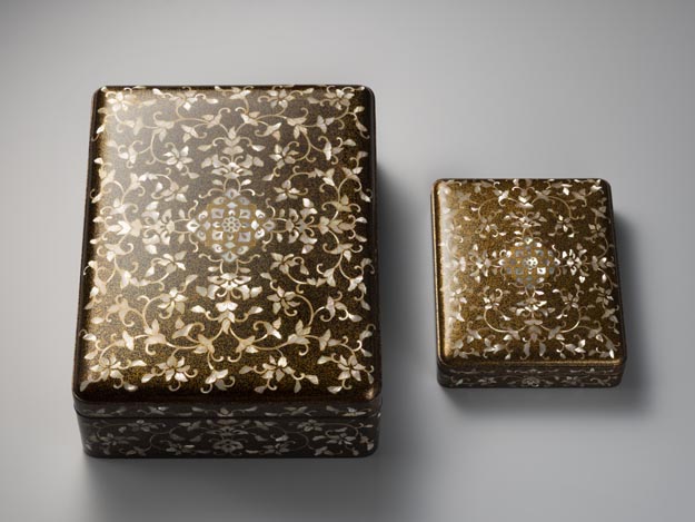 川之邊一朝:梨子地青貝唐草内蒔絵料紙箱・硯箱 (明治時代)