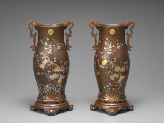 銅器会社:四君子象嵌御菊紋入耳付銅花瓶 (明治時代)