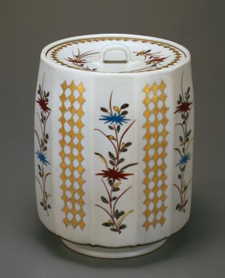 加藤土師萌:色絵金彩菊文水指 (1964)