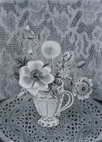 長谷川潔:切子ガラスに挿したアネモネと草花 (1944-45)