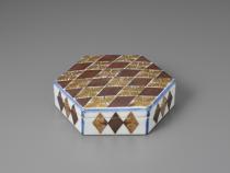 | Small hexagonal box, fern pattern overglaze enamels, gold and silver |
