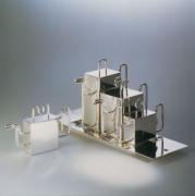| 1983 silver / tea & coffee set (6 pieces) coffee-pot: 24.0×7.5×22.5 (140 cl), tea-pot:24.0×10.0×19.5 (130 cl), milk-jug: 23.0×5.0×14.5(45 cl), sugar-bowl: 20.0×15.0×15.0 (45 cl), spoon: 12.5(l), tray: 51.0×16.0×1.5 |