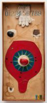 | c.1964 Mixed media (Cotton work gloves, ball, cloth, wire, enamel, paint, pencil and paper on wood) 81.0×35.7 cm |