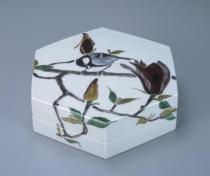 | Hexagonal box, magnolia and tit design, overglaze enamels |