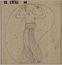 | Stehendes Mädchen en face, mit nach oben gewinkelten Armen(Entwurf für Metalltreibarbeiten der Wiener Werkstätte) |