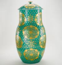 | Lidded Ornamental Jar with Chrysanthemum Design in Gold Leaves, Overglaze Spring Green Enamel |