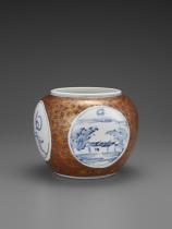 | Jar, landscapes and characters design, underglaze blue, and four-petal flower pattern, overglaze enamels, gold and silver |